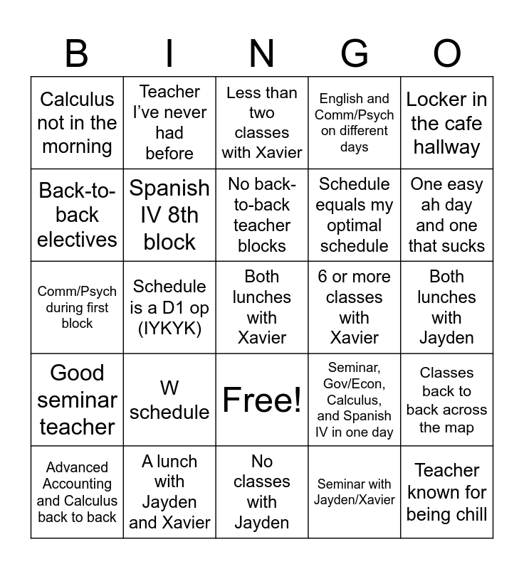 This bingo card has 26 words: Free!, Seminar with Jayden/Xavier, No back-to-back teacher blocks, A lunch with Jayden and Xavier, Locker in the cafe hallway, Calculus not in the morning, Back-to-back electives, Teacher I’ve never had before, Both lunches with Jayden, Seminar, Gov/Econ, Calculus, and Spanish IV in one day, Schedule equals my optimal schedule, Comm/Psych during first block, Classes back to back across the map, Advanced Accounting and Calculus back to back, Schedule is a D1 op (IYKYK), Free Space — Schedule comes out before August, English and Comm/Psych on different days, Good seminar teacher, Less than two classes with Xavier, Both lunches with Xavier, One easy ah day and one that sucks, No classes with Jayden, 6 or more classes with Xavier, W schedule, Spanish IV 8th block and Teacher known for being chill.