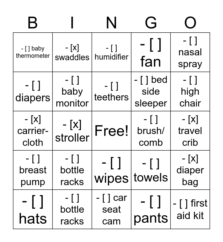 This bingo card has a free space and 62 words: - [ ] bottles, - [ ] bottle racks, - [ ] burp cloths, - [ ] breast pump, - [ ] high chair, - [ ] towels, - [ ] baby monitor, - [ ] crib, - [ ] bed side sleeper, - [ ] crib mattress, - [ ] fan, - [ ] changing pads, - [ ] diapers, - [ ] wipes, - [ ] car seat cam, - [ ] baby thermometer, - [ ] first aid kit, - [ ] nasal spray, - [ ] pasifiers, - [ ] teethers, - [ ] brush/ comb, - [ ] humidifier, - [ ] hats, - [ ] pants, - [ ] outerwear, - [ ] bouncer, - [ ] swing, - [ ] plushies, - [x] diaper bag, - [x] nursing bras, - [x] socks, - [x] footsies, - [x] booties, - [x] onsies, - [x] travel crib, - [x] swaddles, - [x] crib sheets, - [x] bibs, - [x] stroller, - [x] carseat, - [x] carrier- cloth, - [ ] bottles, - [ ] bottle racks, - [ ] burp cloths, - [ ] high chair, - [ ] towels, - [ ] baby monitor, - [ ] fan, - [ ] changing pads, - [ ] diapers, - [ ] wipes, - [ ] car seat cam, - [ ] baby thermometer, - [ ] first aid kit, - [ ] pasifiers, - [ ] teethers, - [ ] brush/ comb, - [ ] humidifier, - [ ] hats, - [ ] pants, - [ ] outerwear and - [ ] plushies.