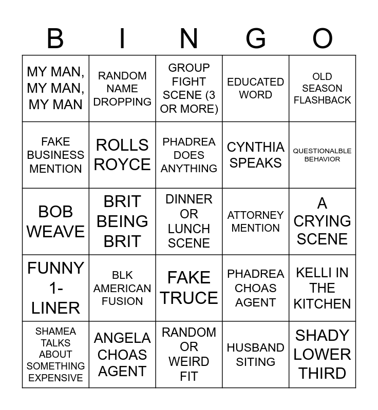 This bingo card has a free space and 24 words: BLK AMERICAN FUSION, ANGELA CHOAS AGENT, PHADREA DOES ANYTHING, SHAMEA TALKS ABOUT SOMETHING EXPENSIVE, OLD SEASON FLASHBACK, MY MAN, MY MAN, MY MAN, FAKE BUSINESS MENTION, RANDOM NAME DROPPING, ATTORNEY MENTION, FAKE TRUCE, CYNTHIA SPEAKS, BOB WEAVE, PHADREA CHOAS AGENT, KELLI IN THE KITCHEN, ROLLS ROYCE, HUSBAND SITING, A CRYING SCENE, GROUP FIGHT SCENE (3 OR MORE), QUESTIONALBLE BEHAVIOR, BRIT BEING BRIT, SHADY LOWER THIRD, FUNNY 1-LINER, EDUCATED WORD and RANDOM OR WEIRD FIT.