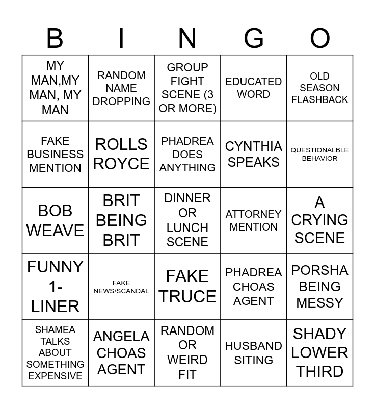 This bingo card has a free space and 24 words: FAKE NEWS/SCANDAL, ANGELA CHOAS AGENT, PHADREA DOES ANYTHING, SHAMEA TALKS ABOUT SOMETHING EXPENSIVE, OLD SEASON FLASHBACK, MY MAN,MY MAN, MY MAN, FAKE BUSINESS MENTION, RANDOM NAME DROPPING, ATTORNEY MENTION, FAKE TRUCE, CYNTHIA SPEAKS, BOB WEAVE, PHADREA CHOAS AGENT, PORSHA BEING MESSY, ROLLS ROYCE, HUSBAND SITING, A CRYING SCENE, GROUP FIGHT SCENE (3 OR MORE), QUESTIONALBLE BEHAVIOR, BRIT BEING BRIT, SHADY LOWER THIRD, FUNNY 1-LINER, EDUCATED WORD and RANDOM OR WEIRD FIT.