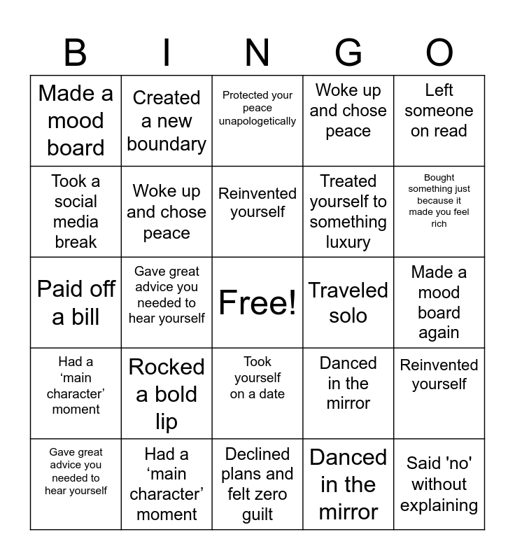 This bingo card has a free space and 24 words: Rocked a bold lip, Had a ‘main character’ moment, Reinvented yourself, Gave great advice you needed to hear yourself, Left someone on read, Made a mood board, Took a social media break, Created a new boundary, Traveled solo, Took yourself on a date, Treated yourself to something luxury, Paid off a bill, Danced in the mirror, Reinvented yourself, Woke up and chose peace, Danced in the mirror, Made a mood board again, Protected your peace unapologetically, Bought something just because it made you feel rich, Gave great advice you needed to hear yourself, Said 'no' without explaining, Had a ‘main character’ moment, Woke up and chose peace and Declined plans and felt zero guilt.