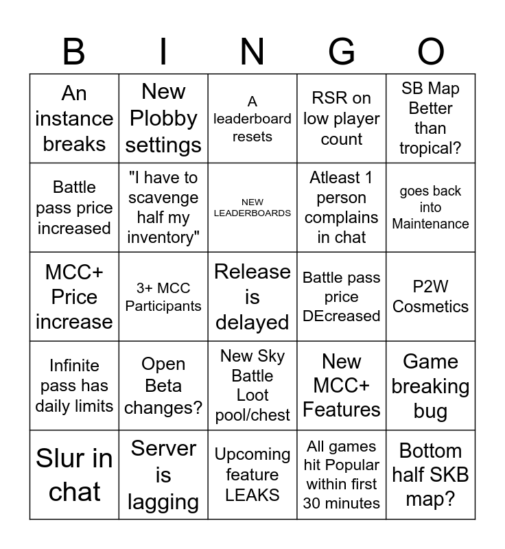 This bingo card has a free space and 59 words: Min 5 people confused about new systems, Server is lagging, Less than 10 new cosmetics, Infinite pass has daily limits, All games hit Popular within first 30 minutes, New currency, "I have to scavenge half my inventory", Hacker spotted, Atleast 1 person complains in chat, Perk system is intuitive, RSR on low player count, Player Count hits 1k, Battle pass price increased, Surprise feature, Mod crashout, An instance breaks, Bottom half SKB map?, SB Map Better than tropical?, Mod gives false information, NEW LEADERBOARDS, Battle pass price DEcreased, A leaderboard resets, Slur in chat, Game breaking bug, TNT Kill Sky battle badge, NEW CROWN LEVEL, Creeper nerfed, SURPRISE NEW SKB ITEM, goes back into Maintenance, 24 hour patch, Broken (OP) BB Kit on a new map, NEW FISH, Fishing rod skins in battle pass, Player count DOESNT break 1k, New Plobby settings, New Cosmetic Page, Royal Reputation rework, 3+ MCC Participants, New Rank, MCC+ Price increase, New Subscription, Open Beta changes?, P2W Cosmetics, P2L Cosmetics, Server waitlist/player count increase, Free redeem, 'New' game info, Actual FULL patch notes, New Sky Battle Loot pool/chest, Upcoming feature LEAKS, NEW Mythic gate cosmetics, New quests, Every game gets new badges, Crown Level set back, More than 1 new paid bundle, New MCC+ Features, New disguise words, Silksong news same day and ANYTHING SG.