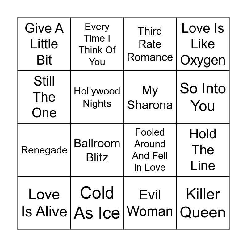 This bingo card has 45 words: Free!, Love Is Alive, Right Back Where We Started From, Say You Love Me, Sir Duke, I'd Really Love to see you Tonight, Third Rate Romance, Smoke From A Distant Fire, Still The One, Rock and Roll Fantasy, Love Is Like Oxygen, Cold As Ice, Some Kind Of Wonderful, My Life, Turn To Stone, Jackie Blue, Knowing Me Knowing You, Fooled Around And Fell in Love, Why Can't We Be Friends, Ballroom Blitz, Every Time I Think Of You, September, Lady Marmalade, Give A Little Bit, Dust In the Wind, Evil Woman, Take The Money And Run, Saturday Night, I Want You Back, Killer Queen, You Make Me Feel Like Dancing, Let'em In, Carry On My Wayward Son, Heard It In A Lovesong, Midnight Rider, Hold The Line, Lido Shuffle, Moonlight Feel Right, Devil Woman, So Into You, Hollywood Nights, Renegade, You're My Best Friend, My Sharona and Free!.