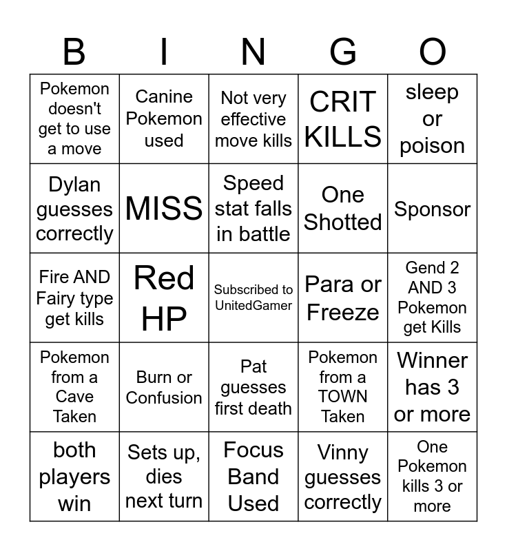 This bingo card has a free space and 24 words: Burn or Confusion, Sets up, dies next turn, Speed stat falls in battle, both players win, sleep or poison, Pokemon doesn't get to use a move, Dylan guesses correctly, Canine Pokemon used, Para or Freeze, Pat guesses first death, One Shotted, Fire AND Fairy type get kills, Pokemon from a TOWN Taken, Winner has 3 or more, MISS, Vinny guesses correctly, Gend 2 AND 3 Pokemon get Kills, Not very effective move kills, Sponsor, Red HP, One Pokemon kills 3 or more, Pokemon from a Cave Taken, CRIT KILLS and Focus Band Used.