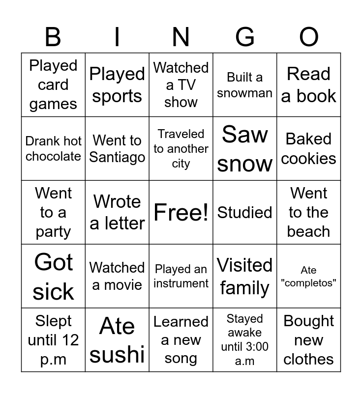 This bingo card has a free space and 24 words: Watched a movie, Ate sushi, Traveled to another city, Slept until 12 p.m, Read a book, Played card games, Drank hot chocolate, Played sports, Studied, Played an instrument, Saw snow, Went to a party, Visited family, Ate "completos", Went to Santiago, Stayed awake until 3:00 a.m, Went to the beach, Watched a TV show, Baked cookies, Wrote a letter, Bought new clothes, Got sick, Built a snowman and Learned a new song.