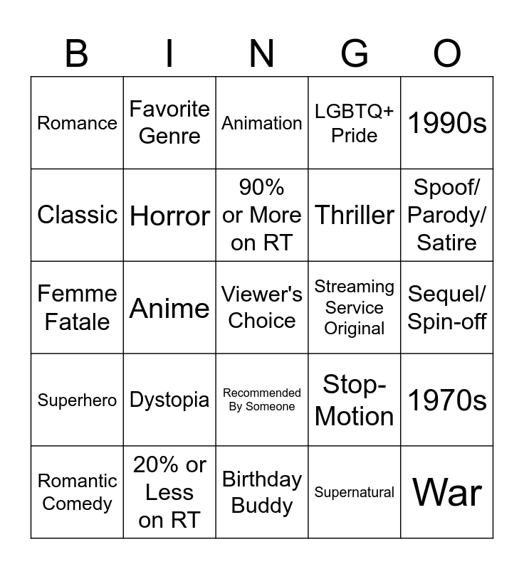 This bingo card has a free space and 84 words: Action, Adventure, Animation, Biography/ Biopic, Comedy, Crime, Documentary, Drama, Family, Fantasy, Mystery/ Noir, History/ Politics, Horror, Streaming Service Original, Music/ Musical, Romance, Romantic Comedy, Classic, Science Fiction, Short Film, Sports, Thriller, War, Western, Anime, Rated G or NC-17, First Letter of Your Name, New Franchise, Coming of Age, Cult Classic, Dystopia, Watch Buddies, Espionage, Femme Fatale, School, Martial Arts, Birthday Buddy, Family Roulette, Spoof/ Parody/ Satire, Superhero, Time Travel, Post-Apocalypse, Zombie, Foreign Film, Released the Year You Were Born, Released This Year, Favorite Genre, Non-Violent, Rewatch a Favorite, Black and White, Talking Animals/ Creatures, Stop-Motion, LGBTQ+ Pride, Cooking/ Baking, Competition, 3+ Hour Movie, 20% or Less on RT, 90% or More on RT, Award Winning, Sequel/ Spin-off, Reboot/ Remake, Binge a Trilogy+, Based on Another Medium, Random Movie, Live Action, 2020s, 2010s, 2000s, 1990s, 1980s, 1970s, 1960s or earlier, Holiday, Indie, Recommended By Someone, Supernatural, Favorite Actor/ Actress, HYPE!!!, Disney, Movie Theater, Mythology, Limited Series, 8.0+ on IMDb and Epic.