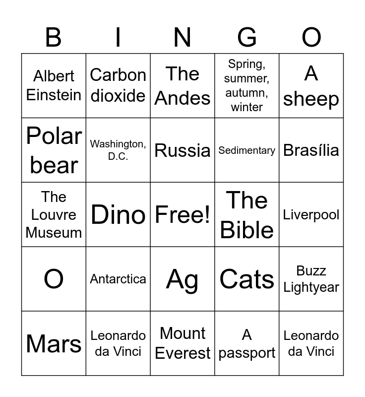 This bingo card has a free space and 50 words: Paris, Leonardo da Vinci, Pacific Ocean, Mount Everest, Antarctica, Peninsula, Carbon dioxide, The Big Dipper, Polar bear, Twelve, Washington, D.C., Spring, summer, autumn, winter, Buzz Lightyear, Cats, Four, Great Britain, Russia, The Bible, Honey, A sheep, Dino, A passport, Albert Einstein, Sedimentary, Eddie Van Halen, 1989, Brasília, Jane Austen, The Andes, Ag, Salvador Dali, Femur, 1912, Buenos Aires, Leonardo da Vinci, 1945, Japanese Yen, 11, Cherry blossom, Liverpool, Shape of You, 88, Alexander Graham Bell, Great Dane, Mars, The Louvre Museum, Ivory, Dr. Seuss, O and Three.