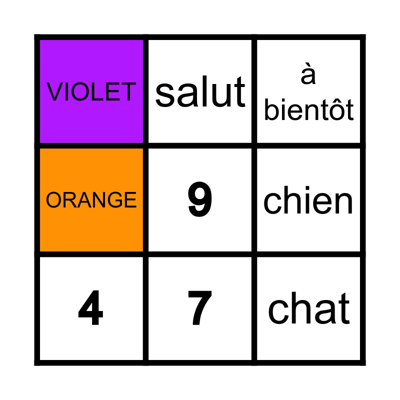 This bingo card has 39 words: 1, 2, 3, 4, 5, 6, 7, 8, 9, 10, ROUGE, ORANGE, JAUNE, NOIR, BLANC, VERT, BLEU, VIOLET, ROSE, GRIS, chien, cochon, chat, pigeon, père, mère, frère, soeur, bonjour, salut, coucou, au revoir, à bientôt, à plus, ça va bien, ça va mal, comment tu t'appelles ?, quel est ton âge ? and ça va plus ou moins.