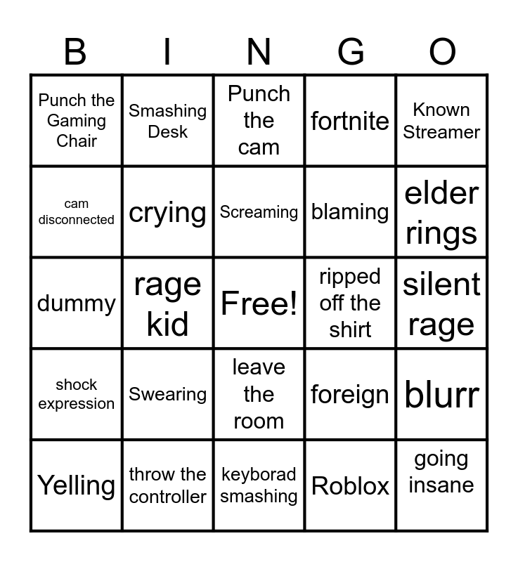 This bingo card has a free space and 24 words: Yelling, Swearing, Screaming, Roblox, Known Streamer, Punch the Gaming Chair, Smashing Desk, Punch the cam, ripped off the shirt, silent rage, dummy, crying, foreign, blurr, cam disconnected, throw the controller, keyborad smashing, fortnite, elder rings, shock expression, rage kid, leave the room, blaming and going insane.