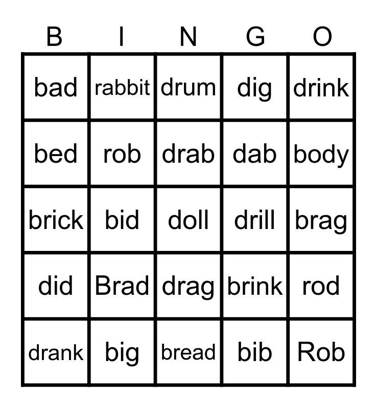 This bingo card has 25 words: Brad, bread, drab, drank, drink, bad, bed, rabbit, drill, drag, dab, brick, brink, rod, rob, Rob, brag, drum, body, bid, doll, big, did, dig and bib.