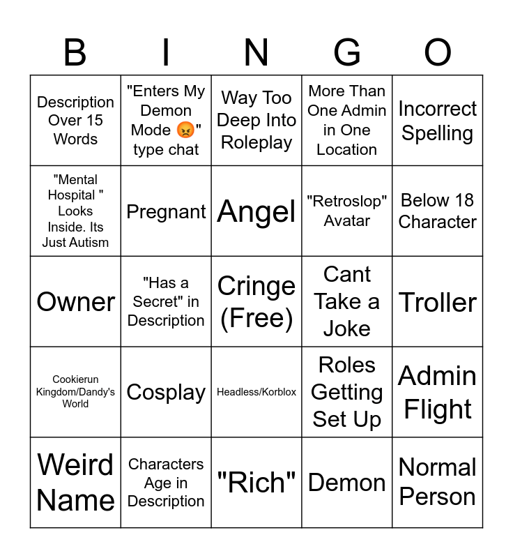 This bingo card has a free space and 24 words: Weird Name, Cosplay, Angel, Demon, Incorrect Spelling, Description Over 15 Words, "Enters My Demon Mode 😡" type chat, Way Too Deep Into Roleplay, Cant Take a Joke, Troller, Owner, Pregnant, Roles Getting Set Up, Admin Flight, "Mental Hospital " Looks Inside. Its Just Autism, Characters Age in Description, "Rich", More Than One Admin in One Location, Below 18 Character, Cookierun Kingdom/Dandy's World, "Has a Secret" in Description, Headless/Korblox, "Retroslop" Avatar and Normal Person.