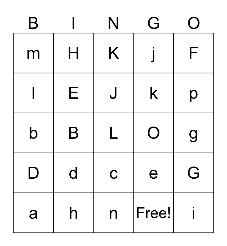 This bingo card has a free space and 32 words: Free!, A, B, C, D, E, F, G, H, I, J, K, M, N, O, P, a, b, c, d, e, f, g, h, i, j, k, l, m, n, o and p.