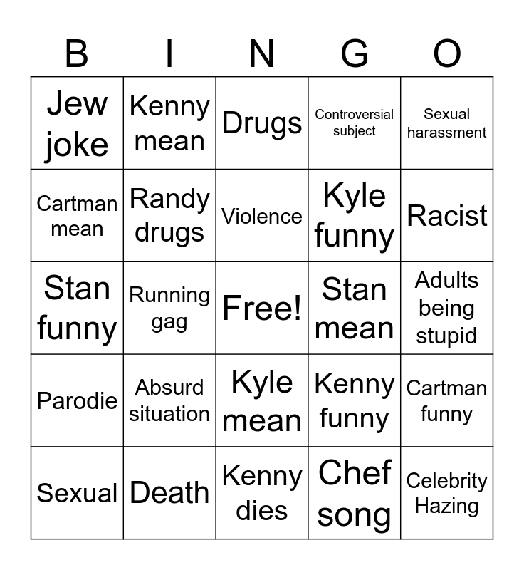 This bingo card has a free space and 24 words: Absurd situation, Death, Violence, Sexual, Sexual harassment, Jew joke, Cartman mean, Kenny mean, Stan mean, Kyle mean, Kyle funny, Stan funny, Kenny funny, Cartman funny, Randy drugs, Chef song, Adults being stupid, Drugs, Racist, Running gag, Celebrity Hazing, Parodie, Controversial subject and Kenny dies.