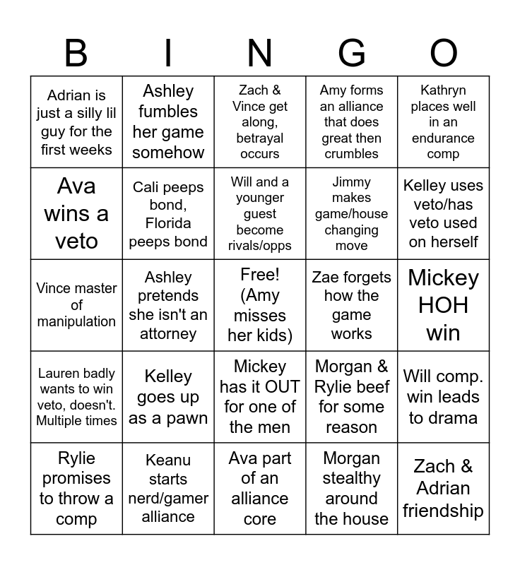 This bingo card has a free space and 24 words: Kelley goes up as a pawn, Keanu starts nerd/gamer alliance, Will and a younger guest become rivals/opps, Rylie promises to throw a comp, Kathryn places well in an endurance comp, Adrian is just a silly lil guy for the first weeks, Ava wins a veto, Ashley fumbles her game somehow, Zae forgets how the game works, Mickey has it OUT for one of the men, Jimmy makes game/house changing move, Vince master of manipulation, Morgan & Rylie beef for some reason, Will comp. win leads to drama, Cali peeps bond, Florida peeps bond, Morgan stealthy around the house, Mickey HOH win, Zach & Vince get along, betrayal occurs, Kelley uses veto/has veto used on herself, Ashley pretends she isn't an attorney, Zach & Adrian friendship, Lauren badly wants to win veto, doesn't. Multiple times, Amy forms an alliance that does great then crumbles and Ava part of an alliance core.