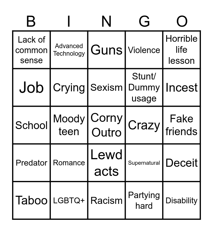 This bingo card has a free space and 25 words: Romance, Racism, Sexism, Taboo, Horrible life lesson, Lack of common sense, Job, Advanced Technology, Crazy, Lewd acts, Stunt/ Dummy usage, School, Supernatural, Deceit, Crying, Abuse, Fake friends, Guns, Incest, Moody teen, Disability, LGBTQ+, Predator, Violence and Partying hard.