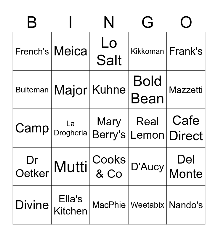 This bingo card has a free space and 24 words: Mutti, Ella's Kitchen, Kuhne, Divine, Frank's, French's, Buiteman, Meica, Real Lemon, Cooks & Co, Bold Bean, Camp, D'Aucy, Del Monte, Major, Weetabix, Cafe Direct, Lo Salt, Mazzetti, La Drogheria, Nando's, Dr Oetker, Kikkoman and MacPhie.
