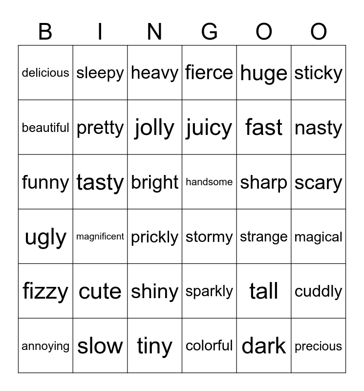 This bingo card has 36 words: sparkly, shiny, colorful, beautiful, ugly, handsome, pretty, tiny, huge, tall, nasty, fierce, cuddly, tasty, juicy, delicious, fizzy, sharp, funny, heavy, bright, magnificent, stormy, prickly, strange, sleepy, fast, slow, jolly, sticky, precious, annoying, magical, scary, cute and dark.