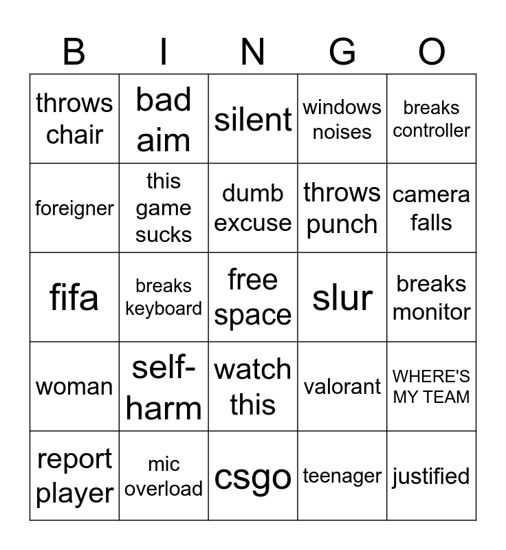 This bingo card has a free space and 24 words: self-harm, mic overload, dumb excuse, report player, breaks controller, throws chair, foreigner, bad aim, slur, watch this, throws punch, fifa, valorant, WHERE'S MY TEAM, this game sucks, teenager, breaks monitor, silent, camera falls, breaks keyboard, justified, woman, windows noises and csgo.