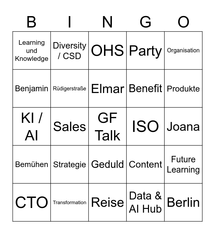 This bingo card has 25 words: Strategie, Reise, Elmar, CTO, Organisation, Learning und Knowledge, Benjamin, Diversity / CSD, ISO, Geduld, Benefit, KI / AI, Content, Future Learning, Rüdigerstraße, Berlin, Joana, OHS, Produkte, Sales, GF Talk, Transformation, Bemühen, Party and Data & AI Hub.