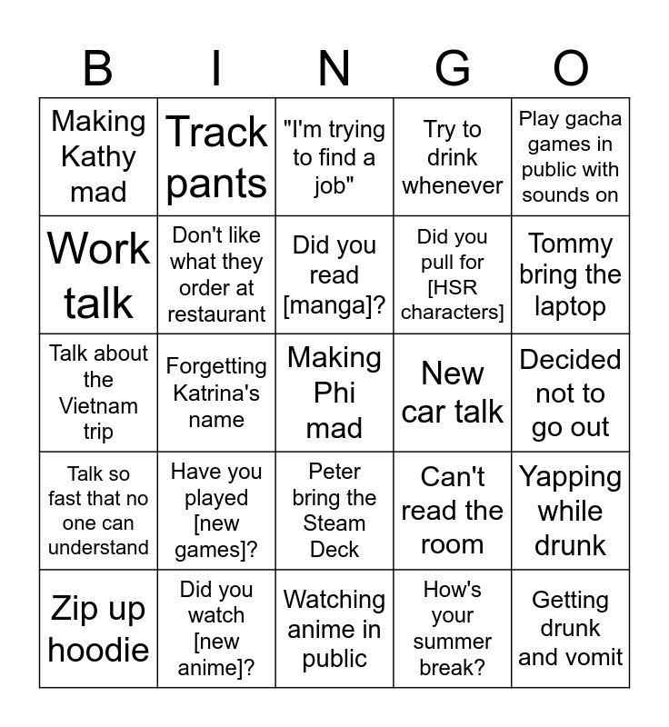 This bingo card has a free space and 24 words: Have you played [new games]?, Did you watch [new anime]?, Did you read [manga]?, Zip up hoodie, Play gacha games in public with sounds on, Making Kathy mad, Work talk, Track pants, New car talk, Peter bring the Steam Deck, Did you pull for [HSR characters], Talk about the Vietnam trip, Can't read the room, Yapping while drunk, Don't like what they order at restaurant, How's your summer break?, Decided not to go out, "I'm trying to find a job", Tommy bring the laptop, Forgetting Katrina's name, Getting drunk and vomit, Talk so fast that no one can understand, Try to drink whenever and Watching anime in public.