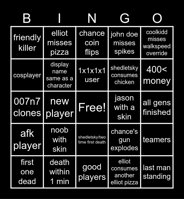 This bingo card has a free space and 49 words: shedletsky misses, last man standing, guest failing a block, good players, noob with skin, toxic player, elliot misses pizza, hitbox is terrible, cosplayer, two time, display name same as a character, john doe misses spikes, teamers, chance's gun explodes, emote party (>2), someone hiding everything, 1x1x1x1 user, jason with a skin, elliot dies first, coolkidd misses walkspeed override, new player, elliot consumes another elliot pizza, friendly killer, shedletsky consumes chicken, killer fails to kill, 400< money, first one dead, 10k+ money, shedletsky/two time first death, afk player, yapper, death due to no stamina, skill issue, you survive with 100 health, death within 1 min, builderman user, vip, backshotting, all gens finished, two time misses dagger, killer leaves, someone afk, milestone IV killer, hider the whole game, 007n7 clones, chance coin flips, 5+ days of playtime, two time revives and end a chase (stop getting targetted by killer).