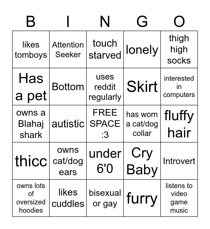 This bingo card has a free space and 24 words: owns cat/dog ears, likes cuddles, uses reddit regularly, owns lots of oversized hoodies, thigh high socks, likes tomboys, Has a pet, Attention Seeker, has worn a cat/dog collar, under 6'0, Skirt, owns a Blahaj shark, Cry Baby, Introvert, Bottom, furry, fluffy hair, touch starved, interested in computers, autistic, listens to video game music, thicc, lonely and bisexual or gay.