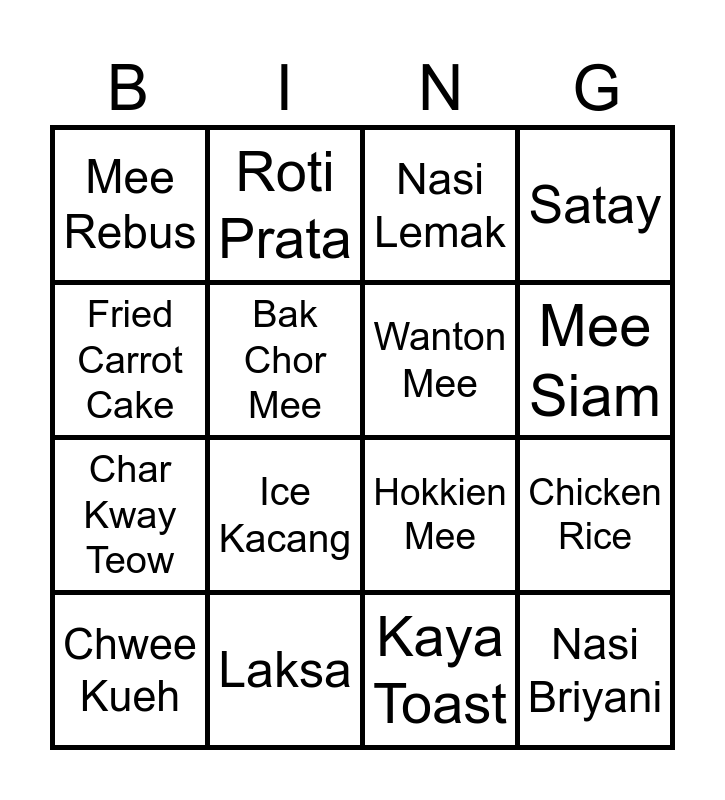This bingo card has 16 words: Laksa, Chicken Rice, Nasi Lemak, Mee Rebus, Char Kway Teow, Roti Prata, Hokkien Mee, Kaya Toast, Fried Carrot Cake, Bak Chor Mee, Chwee Kueh, Satay, Ice Kacang, Mee Siam, Wanton Mee and Nasi Briyani.