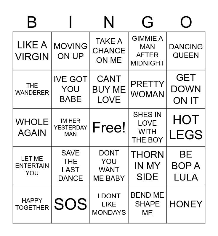 This bingo card has a free space and 44 words: BUS STOP, HONEY, PRETTY FLAMINGO, HAPPY TOGETHER, ROCK THE BOAT, BEND ME SHAPE ME, TAKE A CHANCE ON ME, STAND BY ME, DANCING QUEEN, SOS, GIMMIE A MAN AFTER MIDNIGHT, SHES IN LOVE WITH THE BOY, DONT YOU WANT ME BABY, SAVE THE LAST DANCE, STUCK ON YOU, I DONT LIKE MONDAYS, THE TIDE IS HIGH, WHOLE AGAIN, I NEED A HERO, GET DOWN ON IT, MOVING ON UP, LOVE IS ALL AROUND, GLORIA, LIKE A VIRGIN, STAYING ALIVE, HOT LEGS, THE THINGS WE DO FOR LOVE, SIMPLY THE BEST, THORN IN MY SIDE, LET ME ENTERTAIN YOU, SAVE ALL YOUR KISSES FOR ME, BE BOP A LULA, RUBBER BALL, SUMMERTIME BLUES, IM HER YESTERDAY MAN, NEEDLES AND PINS, OH CAROL, SHE LOVES YOU, CANT BUY ME LOVE, THE WANDERER, PRETTY WOMAN, THE GREEN GREEN GRASS OF HOME, IVE GOT YOU BABE and DIRTY OLD TOWN.