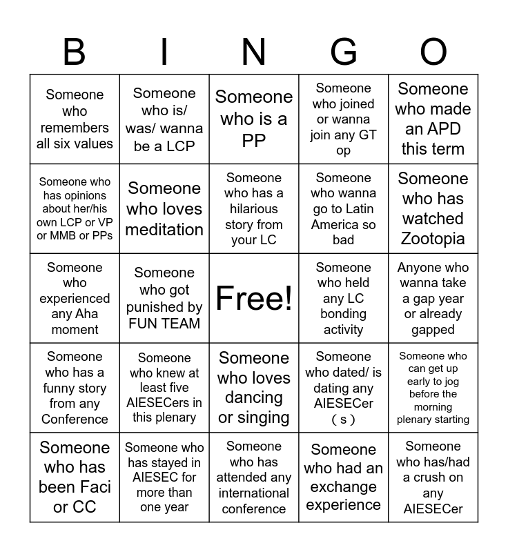 This bingo card has a free space and 34 words: Someone who gets drunk in Skolling, Someone who had an exchange experience, Someone who attended any LC bonding activity, Someone who is an oGVer, Someone who has a funny story from any Conference, Someone who loves meditation, Someone who made an APD this term, Someone who has been Faci or CC, Someone who is/ was/ wanna be a LCP, Someone who has been to Bali, Someone who has a hilarious story from your LC, Someone who is a PP, Someone who has not been Faci or CC, Someone who wanna become the oGV Sales Champion next term, Someone who held any LC bonding activity, Someone who has watched Zootopia, Someone who has stayed in AIESEC for more than one year, Someone who experienced any Aha moment, Someone who knew at least five AIESECers in this plenary, Someone who dated/ is dating any AIESECer(s), Someone who loves dancing or singing, Someone who has his/her birthday this month, Someone who remembers all six values, Anyone who wanna take a gap year or already gapped, Someone who has attended any international conference, Someone who has/had a crush on any AIESECer, Someone who joined or wanna join any GT op, Someone who has desire to twerk with AIESECers in USA, Someone who wanna go to Latin America so bad, Someone who has opinions about her/his own LCP or VP or MMB or PPs, Someone who hates her/his major, Someone who got punished by FUN TEAM, Someone who can get up early to jog before the morning plenary starting and Someone who loves eating spicy food.