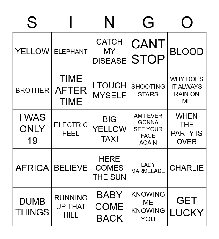This bingo card has 25 words: BELIEVE, BABY COME BACK, I TOUCH MYSELF, DUMB THINGS, BLOOD, YELLOW, BROTHER, ELEPHANT, AM I EVER GONNA SEE YOUR FACE AGAIN, HERE COMES THE SUN, SHOOTING STARS, I WAS ONLY 19, LADY MARMELADE, CHARLIE, TIME AFTER TIME, GET LUCKY, WHEN THE PARTY IS OVER, CATCH MY DISEASE, WHY DOES IT ALWAYS RAIN ON ME, ELECTRIC FEEL, BIG YELLOW TAXI, RUNNING UP THAT HILL, AFRICA, CANT STOP and KNOWING ME KNOWING YOU.
