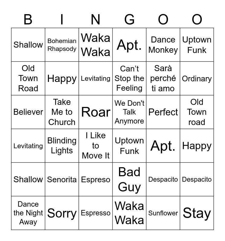 This bingo card has 63 words: Shake It Off, Bad Guy, Let It Go, Blinding Lights, Dance the Night Away, Flowers, Bohemian Rhapsody, Call Me Maybe, Happy, Sunflower, Old Town road, Sarà perche ti amo, Roar, Dance Monkey, Believer, Uptown Funk, Ordinary, Shallow, Take me to Church, Levitating, Perfect, We Don't Talk Anymore, Apt., Despacito, Happier, Waka Waka, Sorry, What Makes You Beautiful, Espreso, Stay, Havana, Bad Habits, Vampire., Blinding Lights, Can’t Stop the Feeling, I Like to Move It, Call Me Maybe, Happy, Sunflower, Old Town Road, Sarà perché ti amo, Take Me to Church, Roar, Dance Monkey, Believer, Uptown Funk, Shallow, Levitating, Happier, Perfect, We Don’t Talk Anymore, Apt., Despacito, What Makes You Beautiful, Sorry, Waka Waka, Stay (The Kid LAROI), Espresso, Shape of You, Bad Habits, Someone You Loved, Senorita and Havana.
