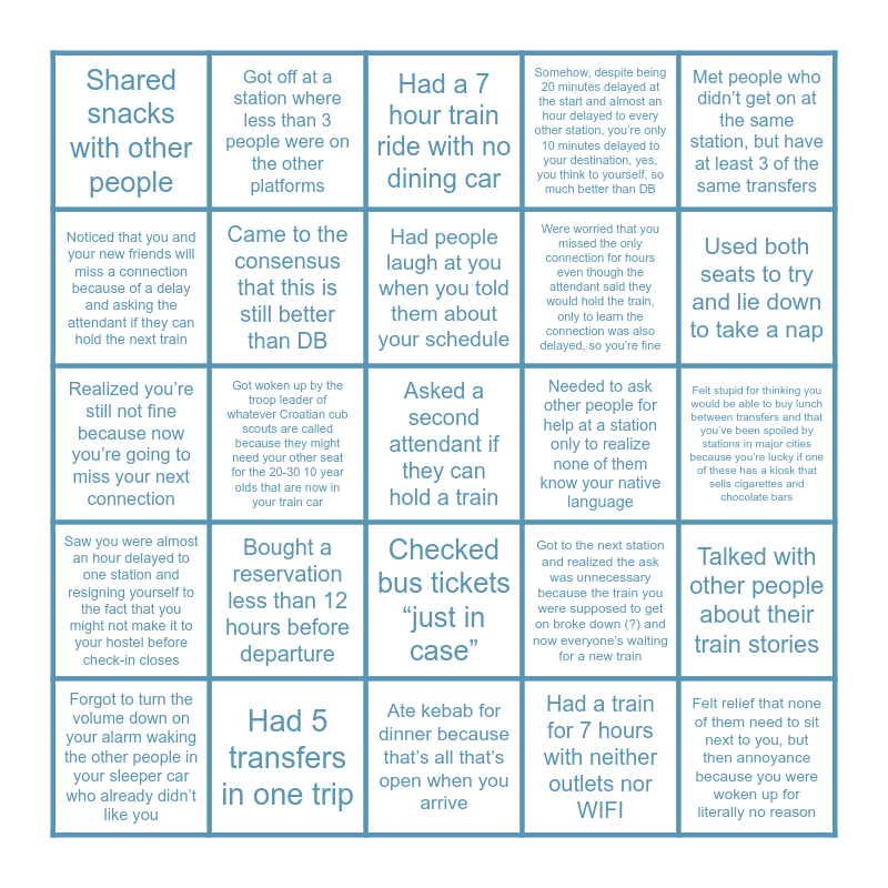 This bingo card has a free space and 24 words: Bought a reservation less than 12 hours before departure, Had 5 transfers in one trip, Had people laugh at you when you told them about your schedule, Forgot to turn the volume down on your alarm waking the other people in your sleeper car who already didn’t like you, Met people who didn’t get on at the same station, but have at least 3 of the same transfers, Shared snacks with other people, Noticed that you and your new friends will miss a connection because of a delay and asking the attendant if they can hold the next train, Got off at a station where less than 3 people were on the other platforms, Needed to ask other people for help at a station only to realize none of them know your native language, Checked bus tickets “just in case”, Were worried that you missed the only connection for hours even though the attendant said they would hold the train, only to learn the connection was also delayed, so you’re fine, Realized you’re still not fine because now you’re going to miss your next connection, Got to the next station and realized the ask was unnecessary because the train you were supposed to get on broke down (?) and now everyone’s waiting for a new train, Talked with other people about their train stories, Came to the consensus that this is still better than DB, Had a train for 7 hours with neither outlets nor WIFI, Felt stupid for thinking you would be able to buy lunch between transfers and that you’ve been spoiled by stations in major cities because you’re lucky if one of these has a kiosk that sells cigarettes and chocolate bars, Had a 7 hour train ride with no dining car, Used both seats to try and lie down to take a nap, Got woken up by the troop leader of whatever Croatian cub scouts are called because they might need your other seat for the 20-30 10 year olds that are now in your train car, Felt relief that none of them need to sit next to you, but then annoyance because you were woken up for literally no reason, Saw you were almost an hour delayed to one station and resigning yourself to the fact that you might not make it to your hostel before check-in closes, Somehow, despite being 20 minutes delayed at the start and almost an hour delayed to every other station, you’re only 10 minutes delayed to your destination, yes, you think to yourself, so much better than DB and Ate kebab for dinner because that’s all that’s open when you arrive.