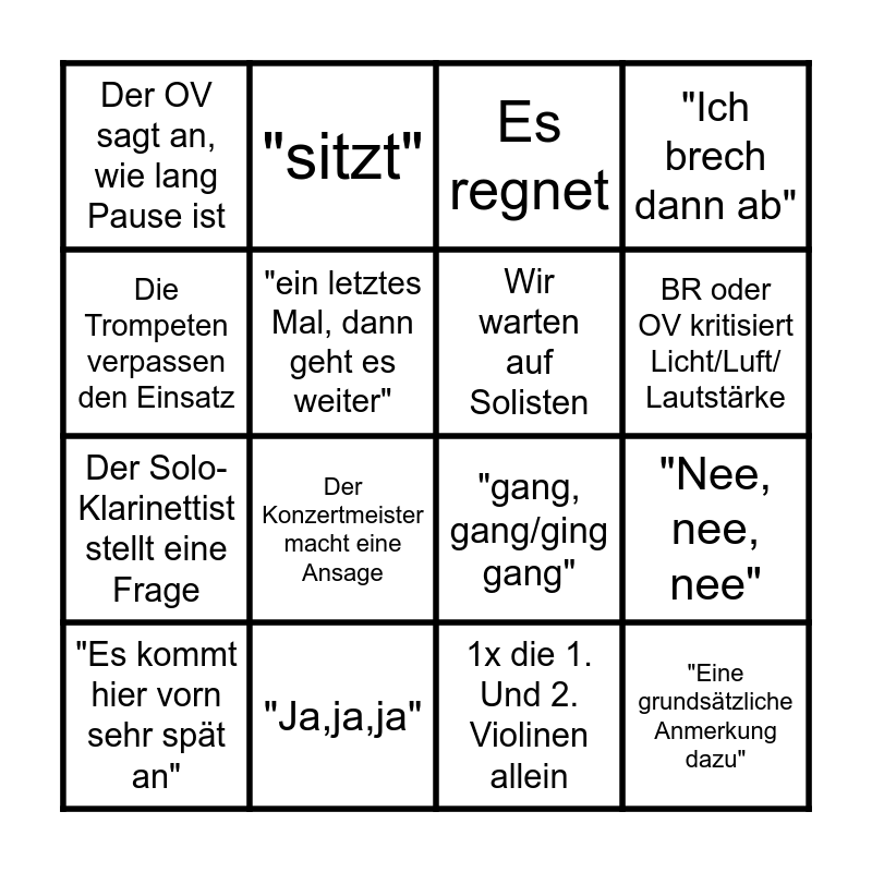 This bingo card has 16 words: "Ja,ja,ja", "Nee, nee, nee", Es regnet, Der OV sagt an, wie lang Pause ist, Der Solo-Klarinettist stellt eine Frage, "sitzt", "gang, gang/ging gang", 1x die 1. Und 2. Violinen allein, Die Trompeten verpassen den Einsatz, "ein letztes Mal, dann geht es weiter", "Es kommt hier vorn sehr spät an", "Ich brech dann ab", Der Konzertmeister macht eine Ansage, BR oder OV kritisiert Licht/Luft/ Lautstärke, Wir warten auf Solisten and "Eine grundsätzliche Anmerkung dazu".