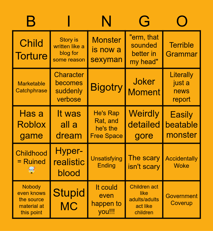 This bingo card has a free space and 24 words: Hyper-realistic blood, Stupid MC, Bigotry, Nobody even knows the source material at this point, Terrible Grammar, Child Torture, Marketable Catchphrase, Story is written like a blog for some reason, Weirdly detailed gore, Unsatisfying Ending, Joker Moment, Has a Roblox game, The scary isn't scary, Accidentally Woke, Character becomes suddenly verbose, Children act like adults/adults act like children, Easily beatable monster, Monster is now a sexyman, Literally just a news report, It was all a dream, Government Coverup, Childhood = Ruined🤯, "erm, that sounded better in my head" and It could even happen to you!!!.