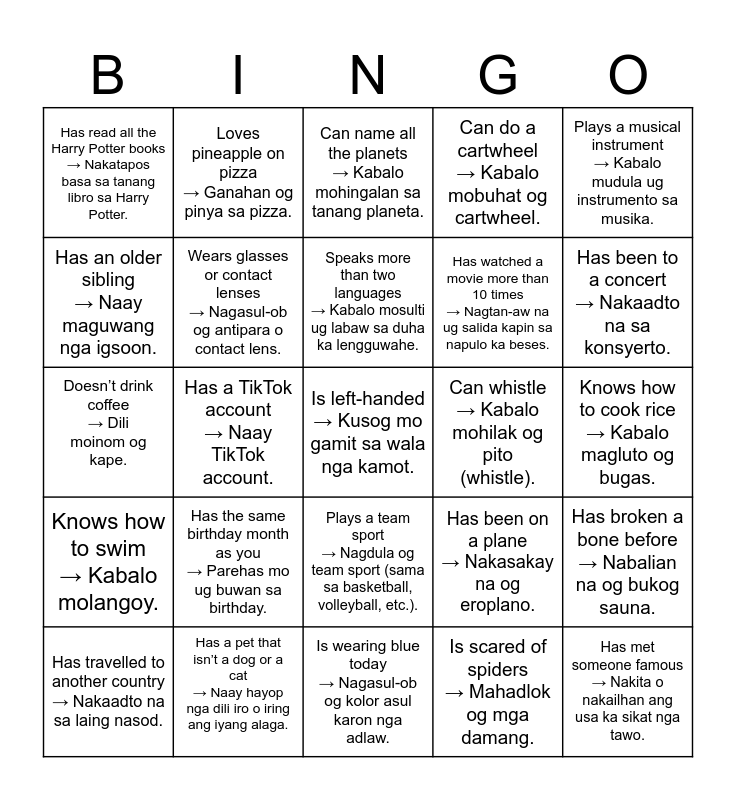 This bingo card has a free space and 24 words: Has the same birthday month as you → Parehas mo ug buwan sa birthday., Has a pet that isn’t a dog or a cat → Naay hayop nga dili iro o iring ang iyang alaga., Speaks more than two languages → Kabalo mosulti ug labaw sa duha ka lengguwahe., Has travelled to another country → Nakaadto na sa laing nasod., Plays a musical instrument → Kabalo mudula ug instrumento sa musika., Has read all the Harry Potter books → Nakatapos basa sa tanang libro sa Harry Potter., Has an older sibling → Naay maguwang nga igsoon., Loves pineapple on pizza → Ganahan og pinya sa pizza., Can whistle → Kabalo mohilak og pito (whistle)., Plays a team sport → Nagdula og team sport (sama sa basketball, volleyball, etc.)., Has watched a movie more than 10 times → Nagtan-aw na ug salida kapin sa napulo ka beses., Doesn’t drink coffee → Dili moinom og kape., Has been on a plane → Nakasakay na og eroplano., Has broken a bone before → Nabalian na og bukog sauna., Wears glasses or contact lenses → Nagasul-ob og antipara o contact lens., Is scared of spiders → Mahadlok og mga damang., Knows how to cook rice → Kabalo magluto og bugas., Can name all the planets → Kabalo mohingalan sa tanang planeta., Has been to a concert → Nakaadto na sa konsyerto., Has a TikTok account → Naay TikTok account., Has met someone famous → Nakita o nakailhan ang usa ka sikat nga tawo., Knows how to swim → Kabalo molangoy., Can do a cartwheel → Kabalo mobuhat og cartwheel. and Is wearing blue today → Nagasul-ob og kolor asul karon nga adlaw..
