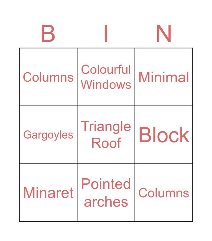 This bingo card has 10 words: Pointed arches, Minimal, Columns, Triangle Roof, Gargoyles, Minaret, Colourful Windows, Sandstone (Hint: Red), Block and Columns.