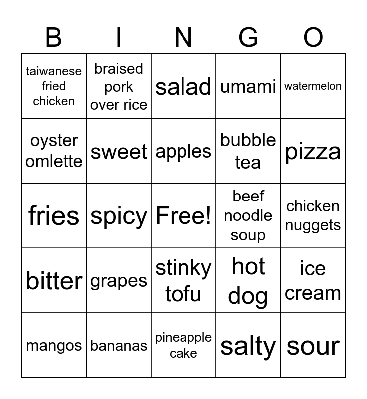 This bingo card has a free space and 24 words: grapes, bananas, apples, mangos, watermelon, taiwanese fried chicken, oyster omlette, braised pork over rice, beef noodle soup, stinky tofu, bubble tea, fries, hot dog, ice cream, sweet, salty, chicken nuggets, salad, pizza, spicy, sour, bitter, umami and pineapple cake.