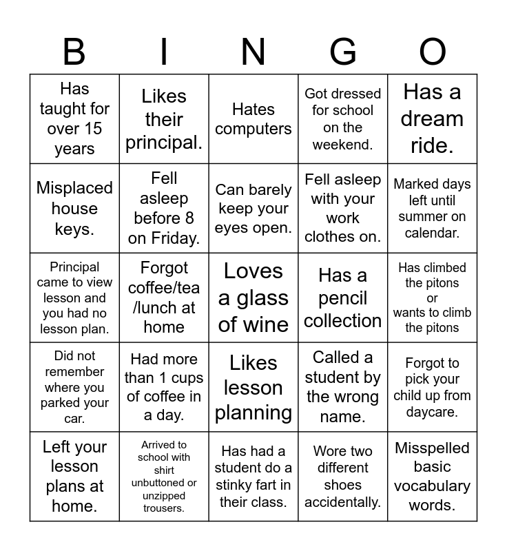 This bingo card has 30 words: Arrived to school with shirt unbuttoned or unzipped trousers., Has taught all grade levels, Forgot coffee/tea /lunch at home, Had to buy a student lunch., Has taught for over 15 years, Hates computers, Fell asleep before 8 on Friday., Likes lesson planning, Has a pencil collection, Has had a student do a stinky fart in their class., Has climbed the pitons or wants to climb the pitons, Loves a glass of wine, Wore two different shoes accidentally., Misspelled basic vocabulary words., Marked days left until summer on calendar., Has had a favourite student., Called a student by the wrong name., Did not remember where you parked your car., Had more than 1 cups of coffee in a day., Has a dream ride., Principal came to view lesson and you had no lesson plan., Bought an outfit on shein/Temu, Likes their principal., Fell asleep with your work clothes on., Misplaced house keys., Got dressed for school on the weekend., Forgot to pick your child up from daycare., Left your lesson plans at home., Can barely keep your eyes open. and Fell asleep with your work clothes on..