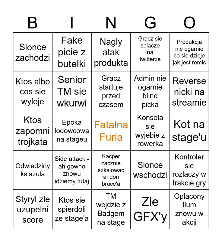 This bingo card has a free space and 24 words: Side attack - ah gowno znowu idziemy tutaj, Ktos sie spierdoli ze stage'a, Gracz startuje przed czasem, Styryl zle uzupelni score, Produkcja nie ogarnie co sie dzieje jak jest remis, Slonce zachodzi, Ktos albo cos sie wyleje, Fake picie z butelki, Konsola sie wyjebie z rowerka, Kacper zacznie szkalowac random bruce'a, Admin nie ogarnie blind picka, Ktos zapomni trojkata, Slonce wschodzi, Kontroler sie rozlaczy w trakcie gry, Senior TM sie wkurwi, Zle GFX'y, Kot na stage'u, Nagly atak produkta, Reverse nicki na streamie, Epoka lodowcowa na stageu, Oplacony tlum znowu w akcji, Odwiedziny ksiazula, Gracz sie splacze na twitterze and TM wejdzie z Badgem na stage.