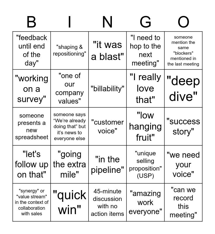 This bingo card has a free space and 24 words: "going the extra mile", "quick win", "billability", "synergy" or "value stream" in the context of collaboration with sales, someone mention the same "blockers" mentioned in the last meeting, "feedback until end of the day", "working on a survey", "shaping & repositioning", "low hanging fruit", "in the pipeline", "I really love that", someone presents a new spreadsheet, "unique selling proposition" (USP), "we need your voice", "one of our company values", "amazing work everyone", "success story", "it was a blast", "deep dive", someone says “We’re already doing that” but it’s news to everyone else, "can we record this meeting", "let's follow up on that", "I need to hop to the next meeting" and 45-minute discussion with no action items.