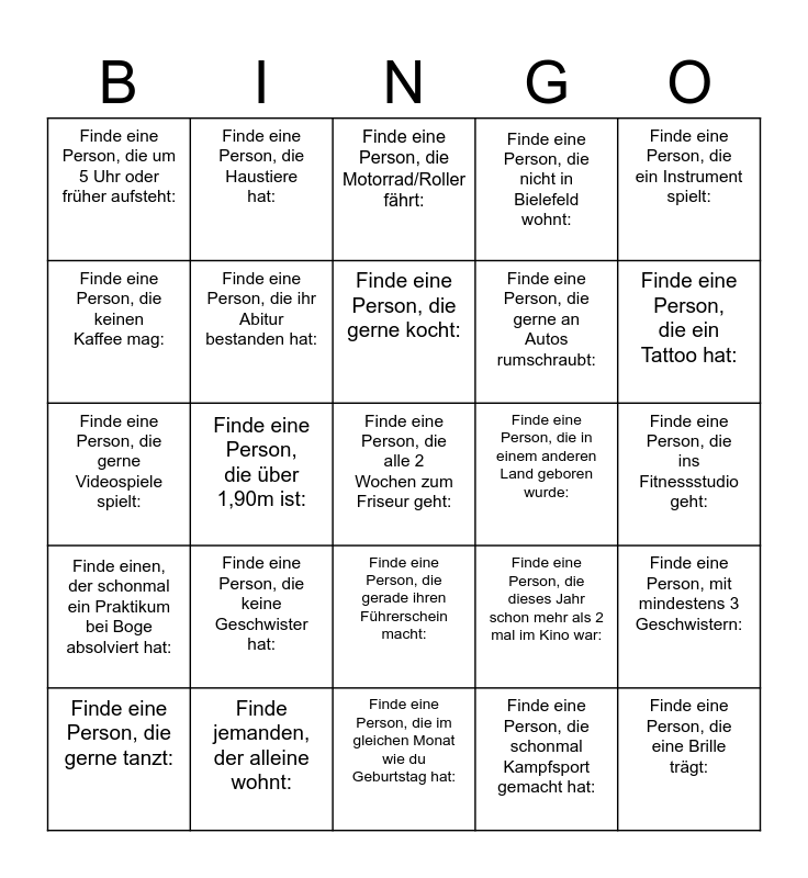 This bingo card has 25 words: Finde eine Person, die keine Geschwister hat:, Finde eine Person, die im gleichen Monat wie du Geburtstag hat:, Finde eine Person, die gerne kocht:, Finde eine Person, die gerne tanzt:, Finde eine Person, die ein Instrument spielt:, Finde eine Person, die um 5 Uhr oder früher aufsteht:, Finde eine Person, die keinen Kaffee mag:, Finde eine Person, die Haustiere hat:, Finde eine Person, die in einem anderen Land geboren wurde:, Finde eine Person, die gerade ihren Führerschein macht:, Finde eine Person, die gerne an Autos rumschraubt:, Finde eine Person, die gerne Videospiele spielt:, Finde eine Person, die dieses Jahr schon mehr als 2 mal im Kino war:, Finde eine Person, mit mindestens 3 Geschwistern:, Finde eine Person, die ihr Abitur bestanden hat:, Finde eine Person, die eine Brille trägt:, Finde eine Person, die ins Fitnessstudio geht:, Finde eine Person, die Motorrad/Roller fährt:, Finde eine Person, die ein Tattoo hat:, Finde eine Person, die über 1,90m ist:, Finde eine Person, die alle 2 Wochen zum Friseur geht:, Finde jemanden, der alleine wohnt:, Finde einen, der schonmal ein Praktikum bei Boge absolviert hat:, Finde eine Person, die nicht in Bielefeld wohnt: and Finde eine Person, die schonmal Kampfsport gemacht hat:.
