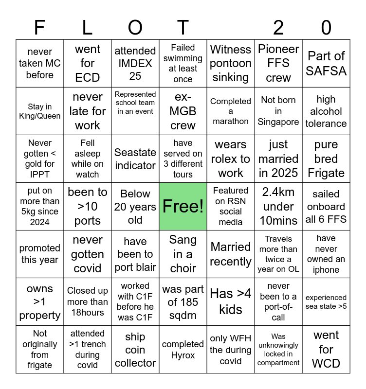 This bingo card has a free space and 48 words: Has >4 kids, Not born in Singapore, completed Hyrox, been to >10 ports, Seastate indicator, sailed onboard all 6 FFS, went for ECD, attended >1 trench during covid, Pioneer FFS crew, Sang in a choir, Part of SAFSA, Failed swimming at least once, just married in 2025, wears rolex to work, owns >1 property, 2.4km under 10mins, Stay in King/Queen, high alcohol tolerance, never been to a port-of-call, Witness pontoon sinking, Completed a marathon, Below 20 years old, never taken MC before, never late for work, experienced sea state >5, Represented school team in an event, pure bred Frigate, Not originally from frigate, have served on 3 different tours, Fell asleep while on watch, Was unknowingly locked in compartment, Featured on RSN social media, have never owned an iphone, Closed up more than 18hours, put on more than 5kg since 2024, Married recently, Travels more than twice a year on OL, Never gotten < gold for IPPT, have been to port blair, worked with C1F before he was C1F, promoted this year, went for WCD, attended IMDEX 25, ship coin collector, ex-MGB crew, was part of 185 sqdrn, never gotten covid and only WFH the during covid.