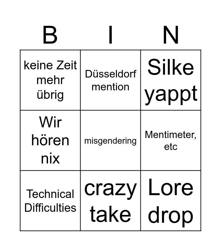 This bingo card has 9 words: Technical Difficulties, Silke yappt, Düsseldorf mention, Wir hören nix, keine Zeit mehr übrig, Mentimeter, etc, misgendering, Lore drop and crazy take.