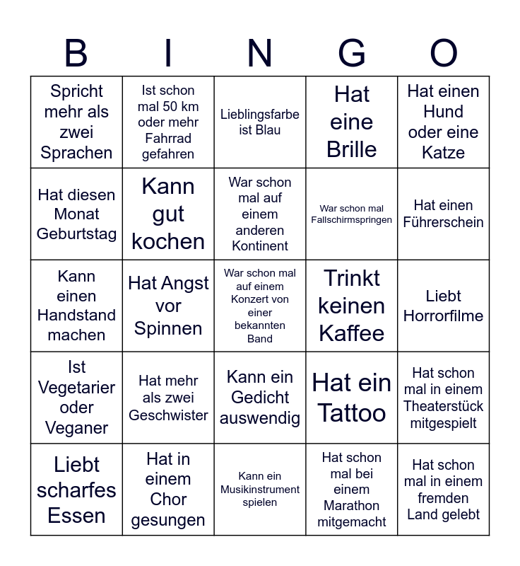 This bingo card has 25 words: Hat mehr als zwei Geschwister, Kann ein Musikinstrument spielen, War schon mal auf einem anderen Kontinent, Liebt scharfes Essen, Hat einen Hund oder eine Katze, Spricht mehr als zwei Sprachen, Hat diesen Monat Geburtstag, Ist schon mal 50 km oder mehr Fahrrad gefahren, Trinkt keinen Kaffee, Kann ein Gedicht auswendig, War schon mal Fallschirmspringen, Kann einen Handstand machen, Hat ein Tattoo, Hat schon mal in einem Theaterstück mitgespielt, Kann gut kochen, Hat schon mal in einem fremden Land gelebt, Liebt Horrorfilme, Lieblingsfarbe ist Blau, Hat einen Führerschein, Hat Angst vor Spinnen, War schon mal auf einem Konzert von einer bekannten Band, Hat in einem Chor gesungen, Ist Vegetarier oder Veganer, Hat eine Brille and Hat schon mal bei einem Marathon mitgemacht.