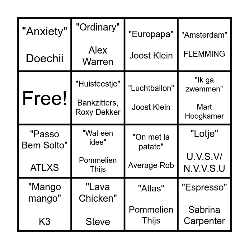 This bingo card has 16 words: "Lava Chicken" Steve, "Lotje" U.V.S.V/ N.V.V.S.U, "Europapa" Joost Klein, "Anxiety" Doechii, "Passo Bem Solto" ATLXS, "Ordinary" Alex Warren, "On met la patate" Average Rob, "Atlas" Pommelien Thijs, Free!, "Huisfeestje" Bankzitters, Roxy Dekker, "Mango mango" K3, "Amsterdam" FLEMMING, "Wat een idee" Pommelien Thijs, "Ik ga zwemmen" Mart Hoogkamer, "Luchtballon" Joost Klein and "Espresso" Sabrina Carpenter.