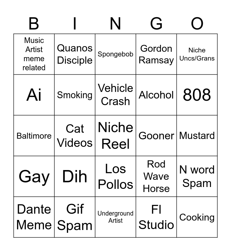 This bingo card has a free space and 24 words: Dih, Gif Spam, Vehicle Crash, Dante Meme, Niche Uncs/Grans, Music Artist meme related, Ai, Quanos Disciple, Gooner, Los Pollos, Alcohol, Baltimore, Rod Wave Horse, N word Spam, Smoking, Fl Studio, Mustard, Spongebob, 808, Cat Videos, Cooking, Gay, Gordon Ramsay and Underground Artist.