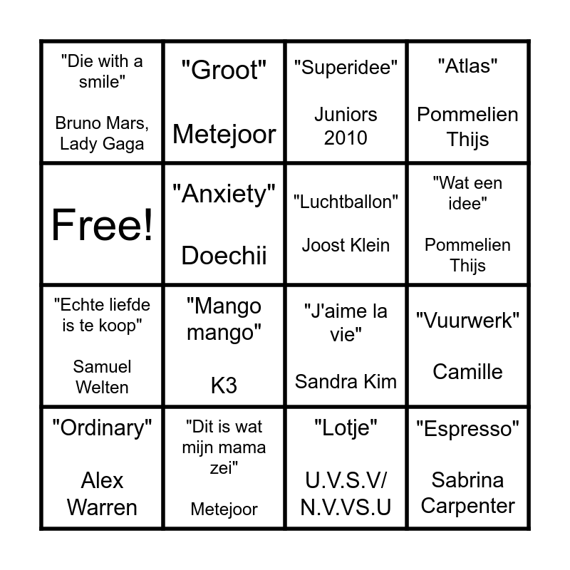 This bingo card has 16 words: "Dit is wat mijn mama zei" Metejoor, "Vuurwerk" Camille, "Superidee" Juniors 2010, "Die with a smile" Bruno Mars, Lady Gaga, "Echte liefde is te koop" Samuel Welten, "Groot" Metejoor, "J'aime la vie" Sandra Kim, "Lotje" U.V.S.V/ N.V.VS.U, Free!, "Anxiety" Doechii, "Ordinary" Alex Warren, "Atlas" Pommelien Thijs, "Mango mango" K3, "Wat een idee" Pommelien Thijs, "Luchtballon" Joost Klein and "Espresso" Sabrina Carpenter.