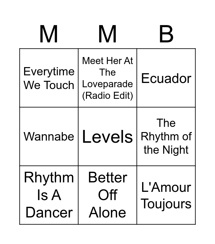 This bingo card has 23 words: No Limit, Gimme! Gimme! Gimme!, Better Off Alone, I Want Your Soul, Levels, Everytime We Touch, The Rhythm of the Night, Meet Her At The Loveparade (Radio Edit), One More Time, Rainbow In The Sky, Freed From Desire, L'Amour Toujours, Désenchantée, Feesttent, Be My Lover, Rock DJ, Ecuador, Encore Une Fois, Rhythm Is A Dancer, Young, Wild & Free, Wannabe, Pump Up The Jam and Boom, Boom, Boom, Boom!!.