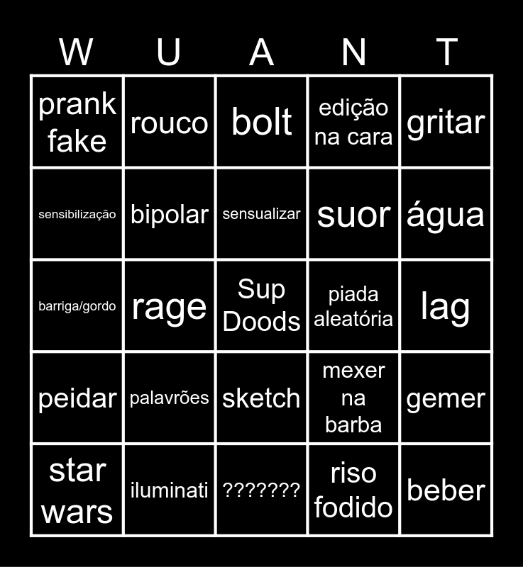 This bingo card has a free space and 24 words: palavrões, iluminati, sensualizar, star wars, gritar, prank fake, sensibilização, rouco, piada aleatória, sketch, suor, barriga/gordo, mexer na barba, gemer, bipolar, riso fodido, lag, bolt, água, rage, beber, peidar, edição na cara and ???????.