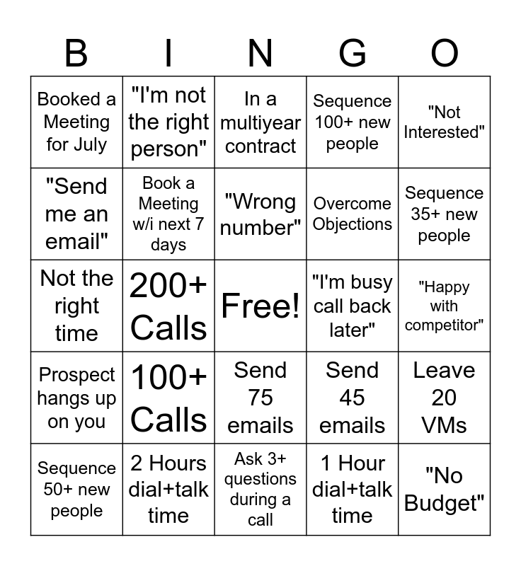 This bingo card has a free space and 24 words: 100+ Calls, 2 Hours dial+talk time, "Wrong number", Sequence 50+ new people, "Not Interested", Booked a Meeting for July, "Send me an email", "I'm not the right person", "I'm busy call back later", Send 75 emails, Overcome Objections, Not the right time, Send 45 emails, Leave 20 VMs, Book a Meeting w/i next 7 days, 1 Hour dial+talk time, "Happy with competitor", In a multiyear contract, Sequence 35+ new people, 200+ Calls, "No Budget", Prospect hangs up on you, Sequence 100+ new people and Ask 3+ questions during a call.